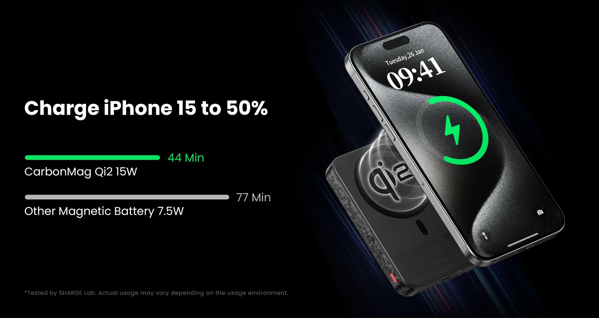 Follow the footprints of Apple, CarbonMag (10K) now supports 15W Qi2 charging compare to 7.5W MagSafe. Perfectly compatible with iPhone 16/15/14/13 series and Android phones that support Qi2.